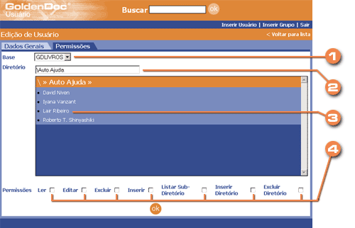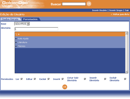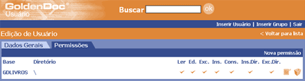 É possível perceber que para a base GDLIVROS, o usuário tem duas permissões: uma para a raiz(\) e outra para o diretório (\Auto Ajuda\Lair Ribeiro). Assim, as permissões da raiz valem para toda a árvore de diretórios desta base, exceto para os ramos abaixo de \Auto Ajuda\Lair Ribeiro. Neste ramo, o usuário só tem permissão de leitura e de listagem de diretórios. Isso significa que os links de cadastrar novo, editar, cortar, remover livros do GoldenDoc não estarão disponíveis neste ramo.