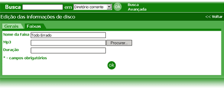 Ao clicar sobre o ícone de edição de uma das faixas, a tela de edição destas informações é apresentada. Esta é uma tela simples de edição de informações como mostra a figura abaixo.