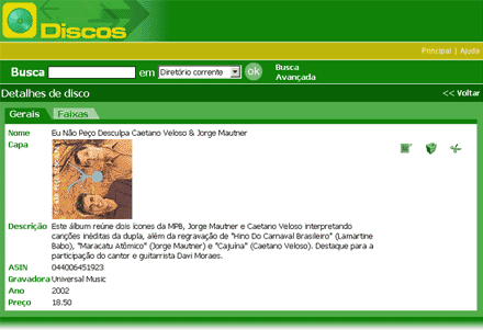 A aplicação de Discos apresenta alguns detalhes importantes sobre o GoldenDoc que não aparecem na aplicação de Livros e por isso também será tratada. A tela que detalha um disco está ilustrada na figura a seguir. Nela aparecem as abas Gerais e Faixas que não aparecem no detalhe de um Livro. A aba Gerais contém os campos que não são multivalorados e a aba Faixas contém o grupo multivalorado Faixas com as músicas que integram o álbum em questão.