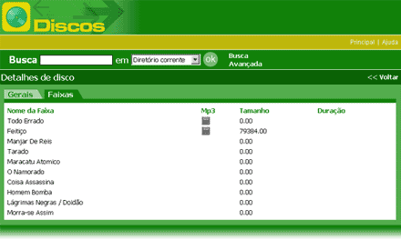 Para visualizar os dados de um grupo, devemos clicar sobre a aba desejada. No exemplo utilizado aqui, para visualizar as Faixas do álbum em questão, devemos clicar sobre a aba Faixas. A figura a seguir ilustra a tela de apresentação dos dados do grupo Faixas.