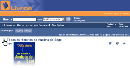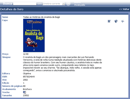 Quando o resultado de uma pesquisa, ou os livros contidos em um diretório, são listados, os campos presentes na base não são, necessariamente, todos apresentados. Os campos apresentados são apenas os mais importantes, ou, principais na identificação da informação desejada. Para visualizar as demais informações de um livro, deve-se visualizar seus detalhes. Para isso, a seta que fica ao lado do primeiro campo é um link para a página de detalhes do livro e, ao ser clicada, a tela de detalhes com as informações do livro específico é apresentada.